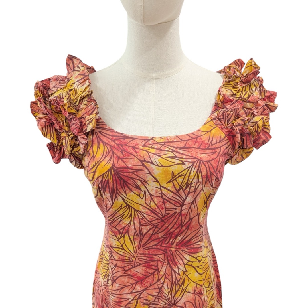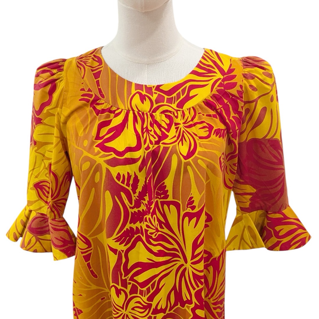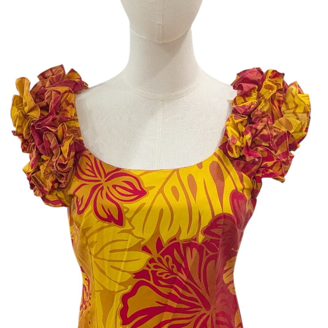 鮮やかなイエローとレッドのハイビスカス柄が目を引く…