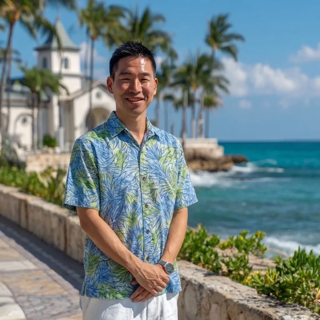 爽やかなブルーにモンステラとバナナリーフ柄が重なり合う、涼しげでハワイらしいアロハシャツ。軽やかな着心地とリラックス感のあるシルエットで、暑い日でも快適に着用できます。ビーチフォトや街歩き、ディナーなど幅広いシーンで活躍。ムームーとのリンクコーデやファミリー撮影にもおすすめの一枚です。