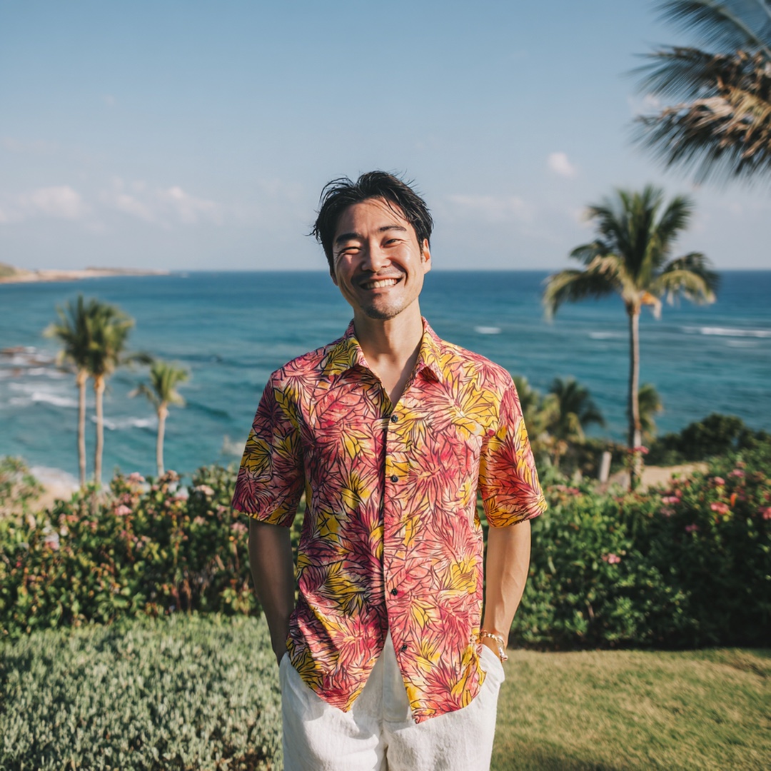 温かみのあるオレンジにモンステラとバナナリーフ柄をあしらった、南国らしい華やかなアロハシャツ。軽やかな着心地とリラックス感のあるシルエットで、ハワイ滞在中のコーディネートにぴったりです。ビーチフォトや街歩き、ディナーなど幅広いシーンで活躍。ムームーとのリンクコーデやファミリー撮影にもおすすめの一枚です。