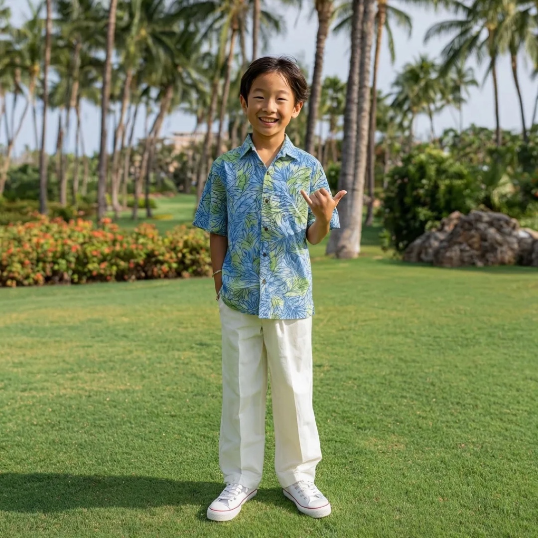 爽やかなブルーにモンステラ&バナナリーフ柄が広がる、南国ムードたっぷりのキッズアロハシャツ。軽くて動きやすく、旅行やリゾート、お出かけにも快適な着心地です。家族でお揃いコーデを楽しめるデザインで、記念写真やイベントにもぴったり。ハワイらしい明るいカラーが、特別な一日をより楽しく彩ります。