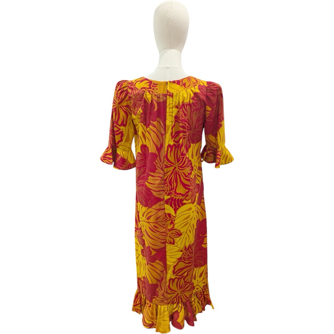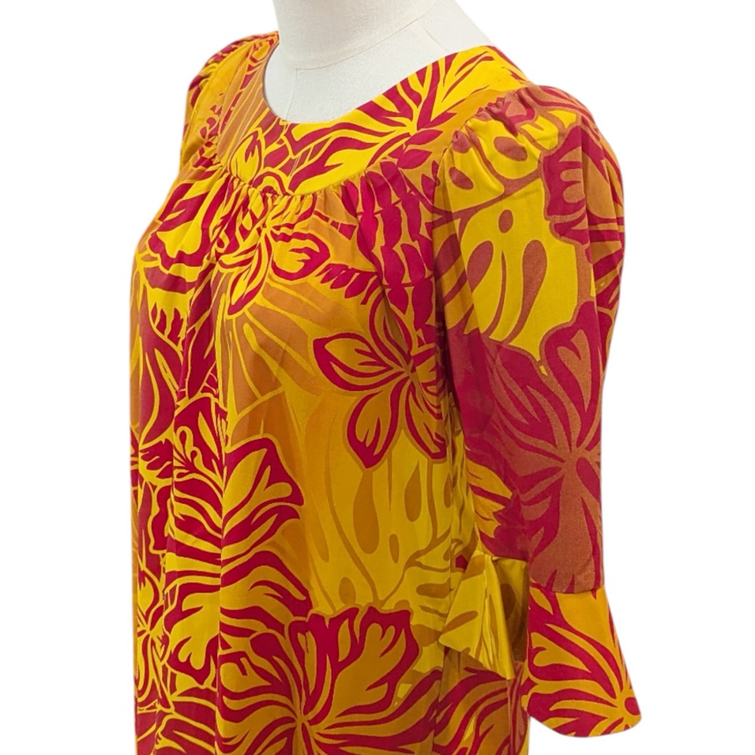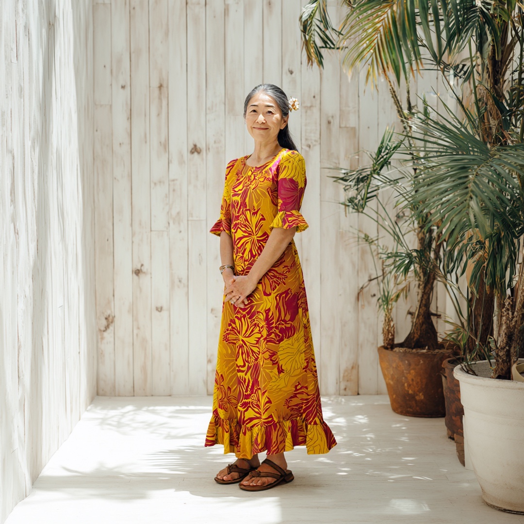 鮮やかなイエローとレッドのハイビスカス柄が目を引く、華やかなロングムームー。ゆったりとしたシルエットと5分袖デザインで、リラックスしながら上品に着用いただけます。裾のラッフルが動くたび軽やかに揺れ、写真映えも抜群。挙式参列やディナー、記念撮影などハワイらしい特別なシーンにおすすめの一着です。