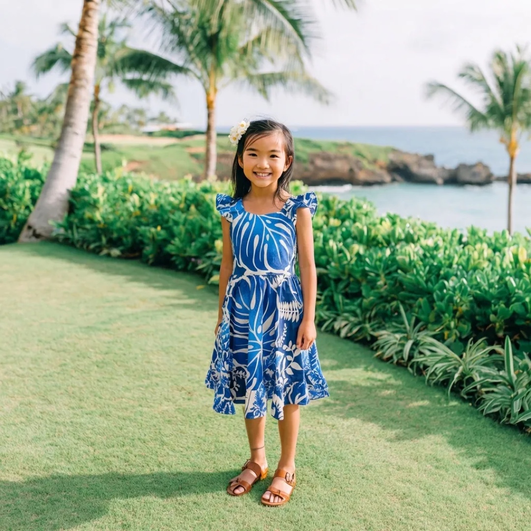 爽やかなブルーカラーにモンステラリーフ柄が映える、ハワイらしいキッズドレス。軽やかで動きやすいシルエットと柔らかな着心地で、旅行中や撮影時も快適に過ごせます。肩のフリルが可愛らしさを引き立て、ビーチフォトや家族写真にもぴったり。ファミリーや兄弟姉妹でのリンクコーデにもおすすめの、リゾート気分を楽しめる一着です。